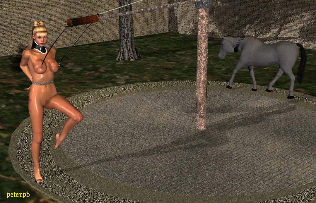 All day she trudged around that exerciser, naked and nipple-leashed. I watched now and then from the window, taking great pleasure in her beauty. A few times I had to go outside and whip her ass, to remind her she had to raise her legs high, gracefully. By mid-afternoon her gait was ingrained into her, almost automatic.