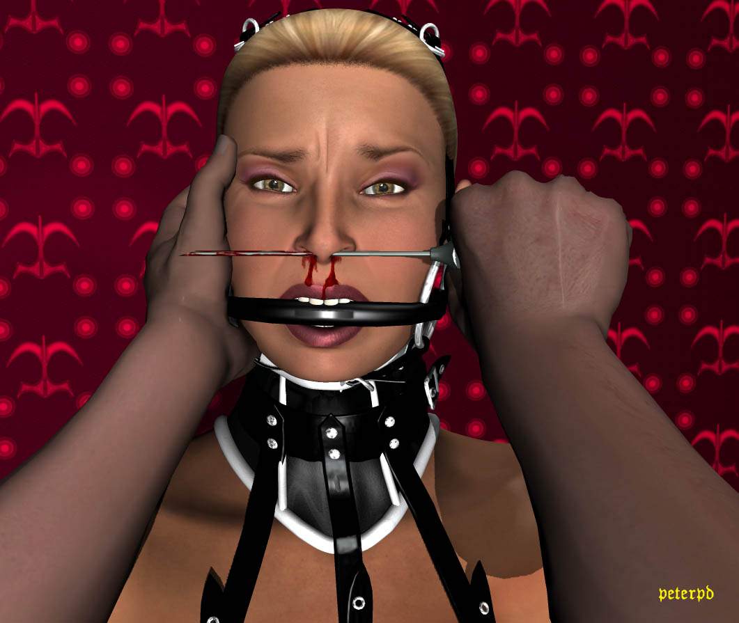 Laura shuddered as she was bitted. The pressure on her tongue was quite unpleasant. She shut her eyes tight and chomped on the bit, concentrating on getting used to the feel. She was still adjusting when she felt the sharp prick in her septum. It was really painful, yet she immediately realized it was another piercing needle and stayed very still, feeling her own warm blood drip and ooze onto her upper lip.