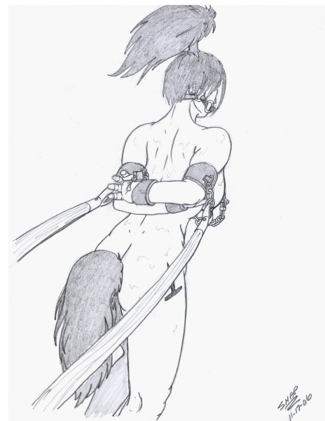 Dragging the inert form over to the center of the aisle, she fitted a leather bondage body harness around the torso. Clicking a snap hook into the back ring, she looped a rope through yet another pulley and pulled the figure off of the ground. It took all of her might, but eventually she had the figure hanging a full three feet off of the stable floor and had tied off the free end of the rope to a nearby post.