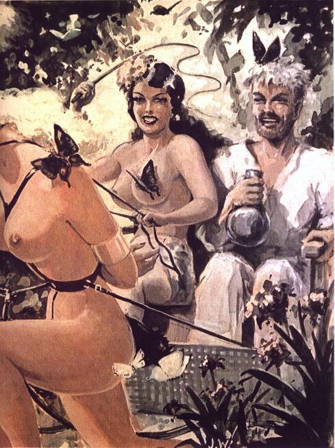 In perfect English (and her voice was like a caress itself, another of the wonders of all these wonderful people) she asked me how I felt, helped me off my stretcher to which I had been glued in astonishment, and then my eyes really did pop out of my head, for behind her in the shade of the trees to which she was leading me were three gorgeous blondes standing shoulder to shoulder in line abreast in front of a little rickshaw to which I saw they were attached by harness like ordinary ponies. They had nothing on either except the harness and bridles and sandals, a tassel of colored beads fore and aft so to speak, and a large plume attached to the brow band of the bridle.